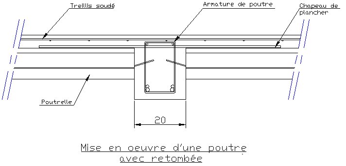 - Pour la hauteur de la poutre , le TRUC c'est de prendre sa longueur est de la diviser par 10. Ex: j'aie une poutre de 5.25 ml qui appuie sur un mur de 20 cm alors hauteur empirique prévue de la poutre = 5.25 ml /10 = 0.52 = 52 cm donc section béton de la poutre = 20*52 ht si votre plancher a une épaisseur de 20 cm alors la retombée de la poutre = 52-20 = 32 cm de retombée .(astuce valable uniquement en maison individuelle ou les descentes de charges sont peu élevées et pas pour un immeuble)