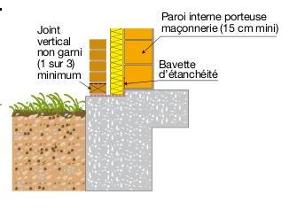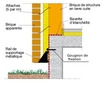 Le point technique délicat c'est le gougeon de fixation .Il a l'air de rien mais c'est lui qui va décider de la nature du mur de fondations .Cad qu'il faudra que le mur ait des caractéristiques physiques avec une bonne résistance à l'arrachement .Ainsi un mur en béton armé plein aura une bonne résistance à l'arrachement du gougeon .Tandis que des murs comme le parpaings , le béton cellulaire seront exclus .Le poids des briques de parement arracheraient les gougeons de leur support .